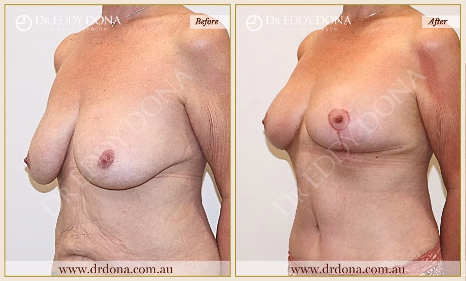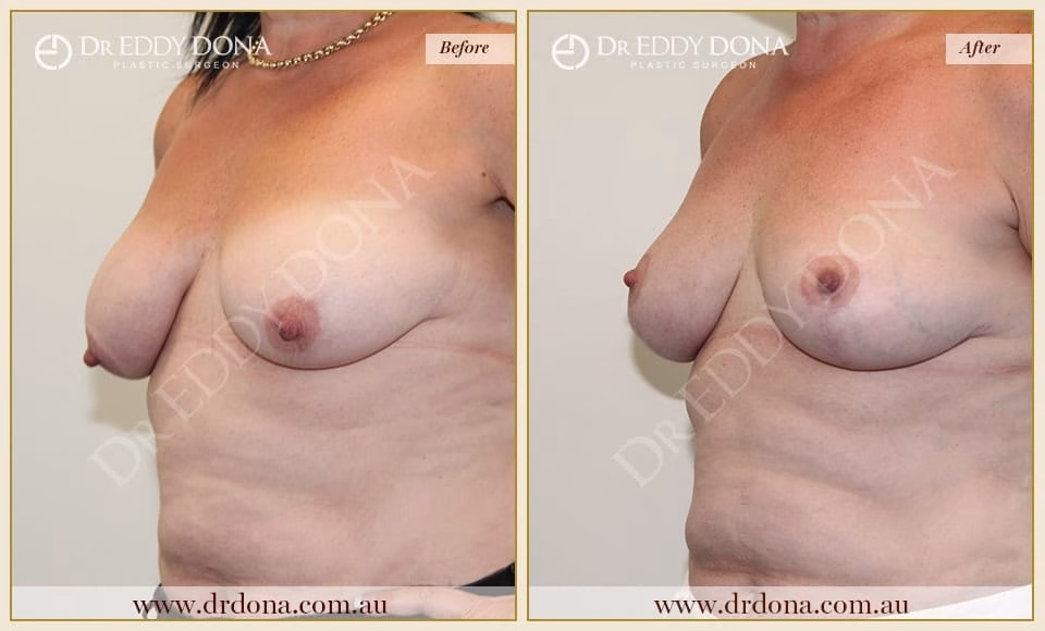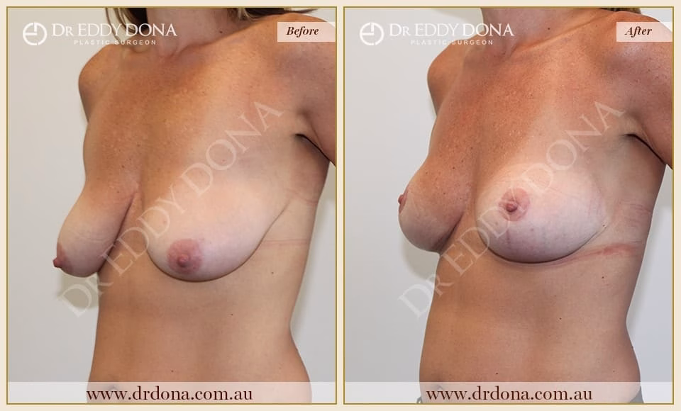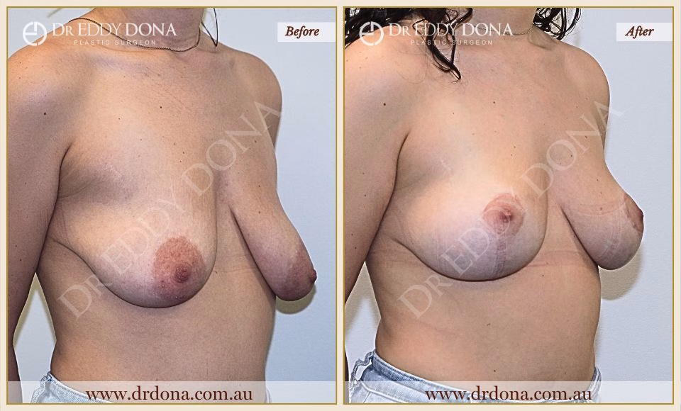 A Breast Lift (Mastopexy) is a surgical procedure that addresses breast droop (ptosis). It lifts and improves the shape of the breast without changing the breast volume. Mastopexy involves lifting the nipple position, tightening the lower part of the breast, and often increasing the breast volume, particularly in the upper part of the breast. Breast Lift surgery is performed in a private hospital under general anaesthesia.