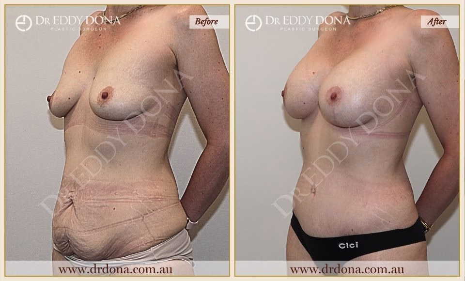 Lower Body Lift (Abdominoplasty) + Breast Implants, R – 395cc + L – 355cc. Anatomical, Dual Plane, Moderate Profile.